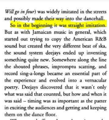 Jamaicans did not invent rap, nor did they significantly contribute to the development of African-American music in comparison to us being the main inspirations for ska and reggae. Hip hop is 98% AA and maybe 2% “Caribbean “that 2% Caribbean influence was already influenced by AA music.